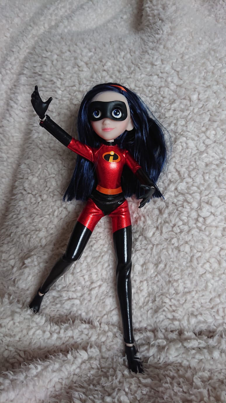 I bought this doll to celebrate the release of the second incredibles film and because as a child I owned a Violet action figure that time and time again kept falling apart resulting in dissappointment. The incredibles played a huge part in my childhood and that is why Violet is one of my favourites and a prized doll in my collection.